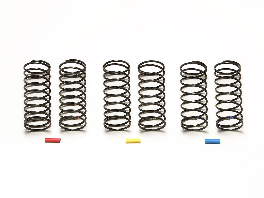 【 RCカーの性能アップやセッティングに役立つパーツです 】 ソフト(赤印)、ミディアム(黄印)、ハード(青印)の3種を2本ずつセットしてセッティングが可能。ビッグボアARダンパーに使用する4WDバギー用のフロントスプリングセットです。識別用カラーチューブ付き。